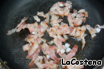 Бекон выкладываем на сковороду и жарим без масла до тех пор, пока бекон не станет золотистым.