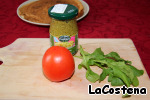 Пока блинчики томятся в духовке, подготовим украшение. Нам нужен соус песто, оливковое масло, помидор и руккола.