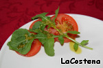 Помидор порежем кружочком, выложим сверху листки рукколы и все польем смесью оливкового масла и песто.