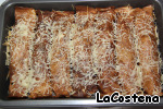 Когда мы уложили все блины, посыпаем сверху тертым сыром и ставим в духовку на 10 минут.