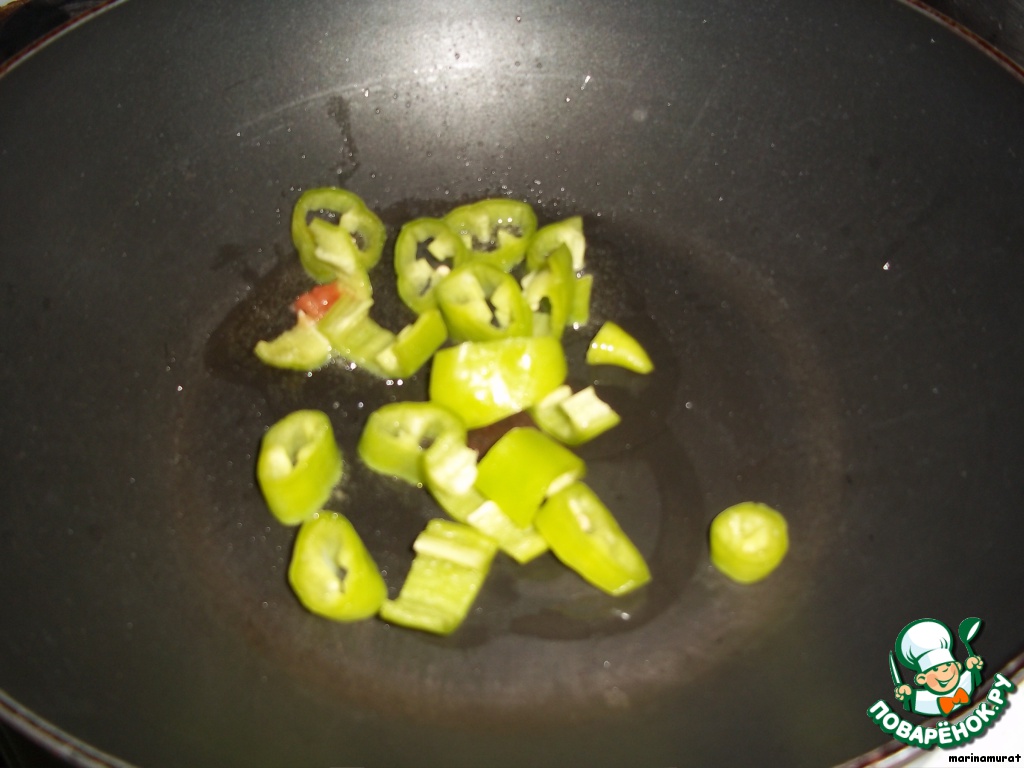 Наша с мужем семья пока еще маленькая, поэтому столько продуктов нам не нужно. Начнем готовить. Режем перец не очень мелко и обжариваем минутки 2 на масле. -