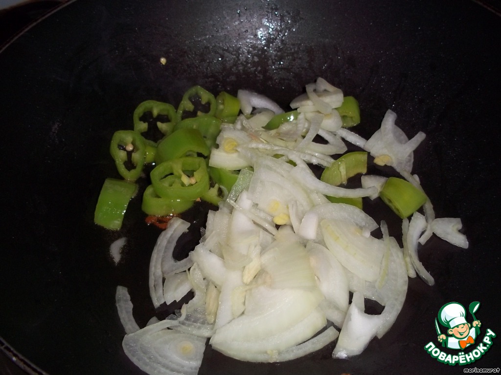 Лук режем полукольцами и добавляем к перцу, жарим 3-4 минуты.