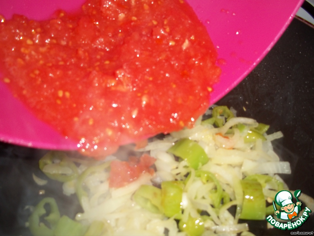 Нам нужна кашица из помидоров, поэтому либо отправляем их в блендер, либо трем на терке. Добавляем к перцу и луку и перемешиваем, тушим 5 минут под крышкой.