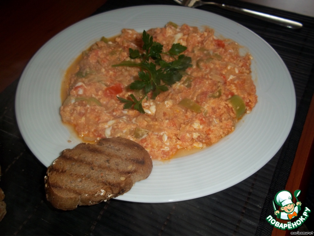 В Турции завтрак занимает особое место. Название kahvalti ("завтрак") происходит от словосочетания kahve alti ("под кофе"), что означает "еда, предшествующая кофе". В старину после завтрака обязательно выпивали чашечку турецкого кофе. На сегодняшний день обычай распития утреннего кофе слегка утратил свою актуальность, более принято употреблять свежий, ароматный, хорошо заваренный чай. Традиционные турецкие завтраки затяжные, часто плавно перетекающие в обед. Я Вас хочу познакомить с одним из таких завтраков. Менемен - это национальный турецкий завтрак из лука, перца, помидоров и яиц. Даже можно сказать, что это король завтраков!!!! Готовится быстро и из простых ингредиентов, а вкуснотища!!!!!