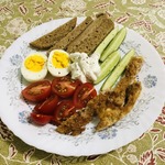 Выкладываем все наши ингредиенты (кроме яиц) на большую плоскую тарелку рядами.