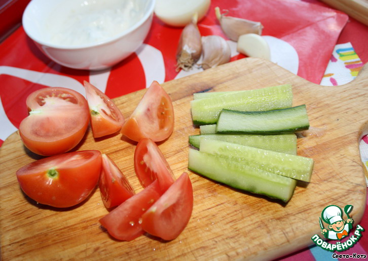 Помидоры нарезаем дольками, огурец - брусками, яйца - на четыре части.