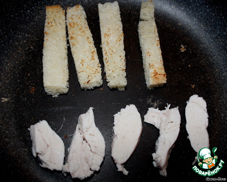 Обжариваем на сухой сковороде со всех сторон хлеб и грудку.