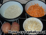 Морковь и сельдерей очистить. Сельдерей натереть на крупной терке, морковь нарезать соломкой. Рис хорошо промыть несколько раз.