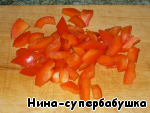 У меня в холодильнике завалялся кусочек красного болгарского перца, немного меньше половинки. Решила и его пустить в дело. Перец нарезать на полоски и затем на ромбики.