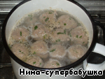 Воду вскипятить, подсолить, опустить в нее фрикадельки и варить 7 минут. Я варила в два приема по 15 штук.