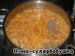 В кипящий бульон опустить картофель, довести до кипения, добавить зажарку.