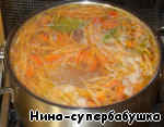Когда суп снова закипит, всыпать рис, довести до кипения, убавить огонь, посолить по вкусу и варить 10 минут.
