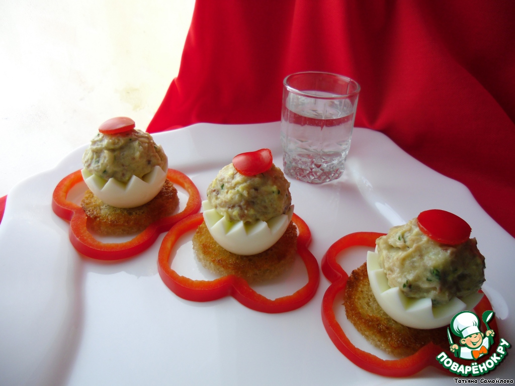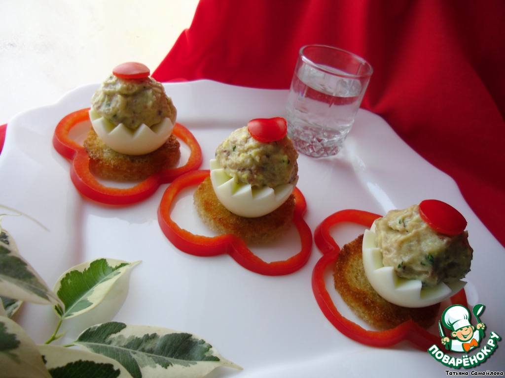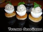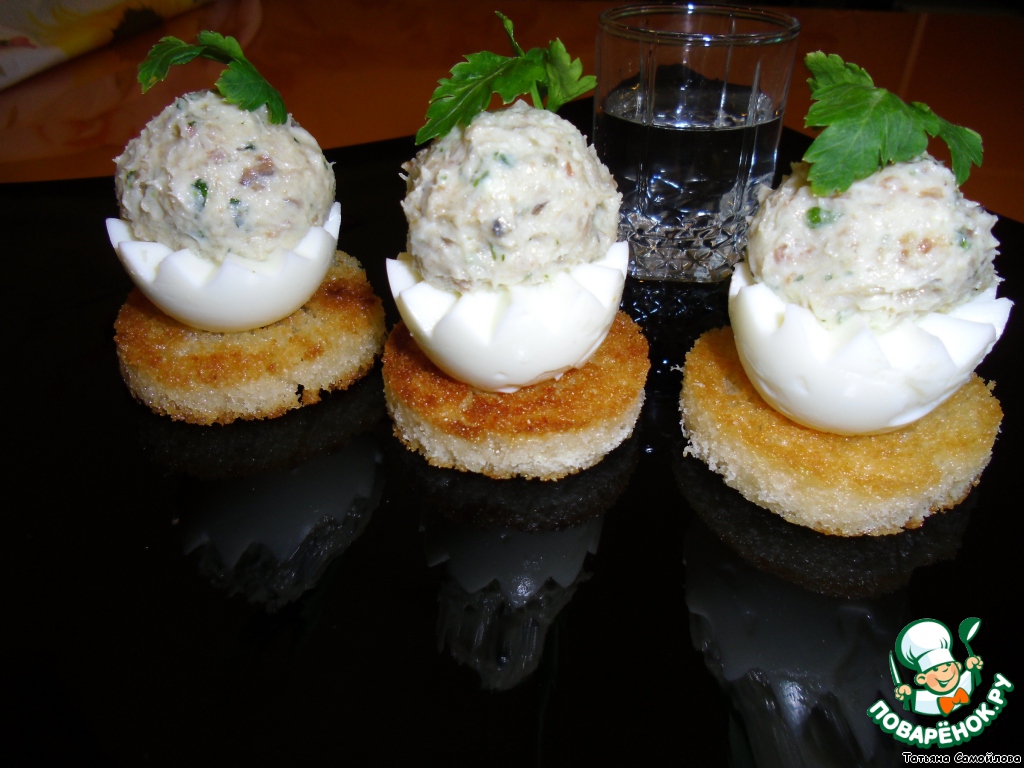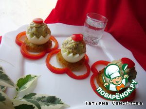 Хлеб обжариваем с одной стороны, на него ставим белок с селедочным шариком. Закуска готова!!!