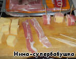 Сыр нарезать кубиками со стороной 2 см. Полоски бекона разрезать вдоль на ленточки. Каждый кубик сыра обернуть полоской бекона и заколоть зубочисткой. -