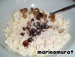 Творог растираем с ванилином, добавляем мелко нарезанные курагу и инжир (у меня были крупные, я брала по одной штучке). Творог у меня был немного суховат, я добавила ложку йогурта. Все перемешали. -