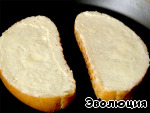 Готовим одну порцию. Ломтики хлеба с двух сторон смазываем сливочным маслом и обжариваем до аппетитной корочки.