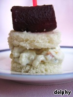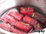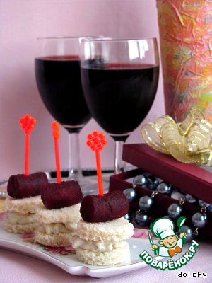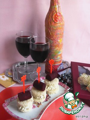 Очень изящная дамская закуска с нежным кремом из голубого сыра и фиников и кусочом пряного яблока в красном вине. К этой закуске предложите вино.
