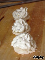 Сырно-финиковый крем переложите в кулинарный мешок и отсадите небольшое количество (примерно 1 ч. л.) на половину подготовленных кусочков хлеба.