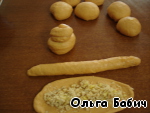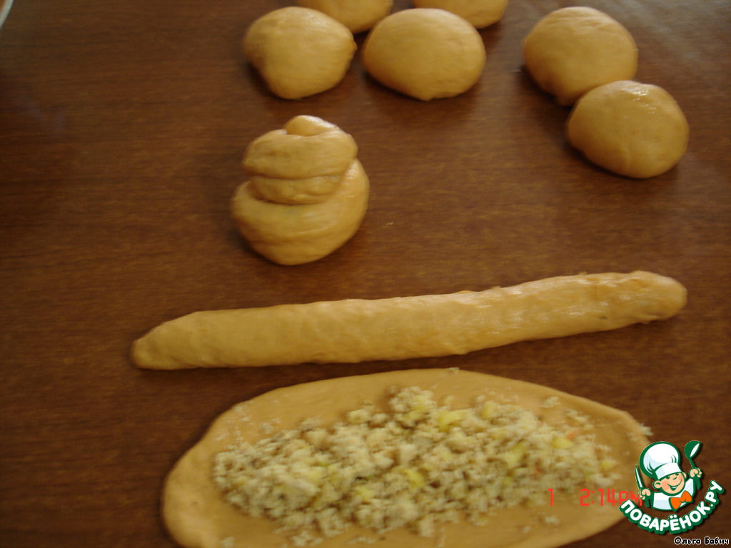Раскатать каждый шарик, укладываем начинку, сворачиваем рулетиком и укладываем в форме улитки. -
