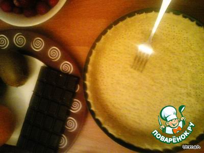 Тесто распределить по дну и боковым сторонам сковороды или специальной формы для выпекания (диаметр 22~24см). Сделать на тесте много проколов вилкой.