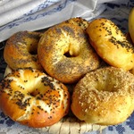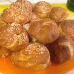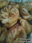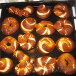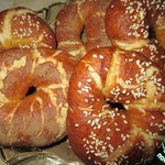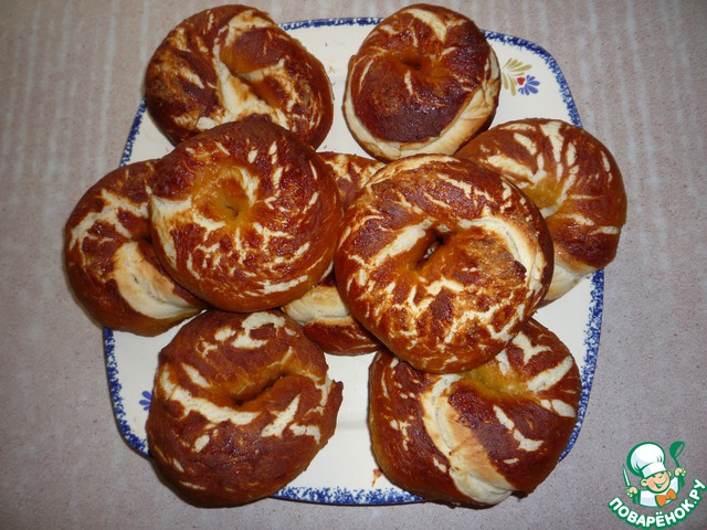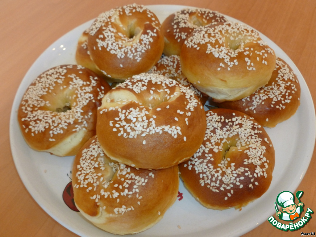Вынимаем из кастрюли, дать стечь воде, застелить противень и укладываем бублики. Посыпаем кунжутом или маком, можно просто крупной солью. Смазывать ничем не нужно.