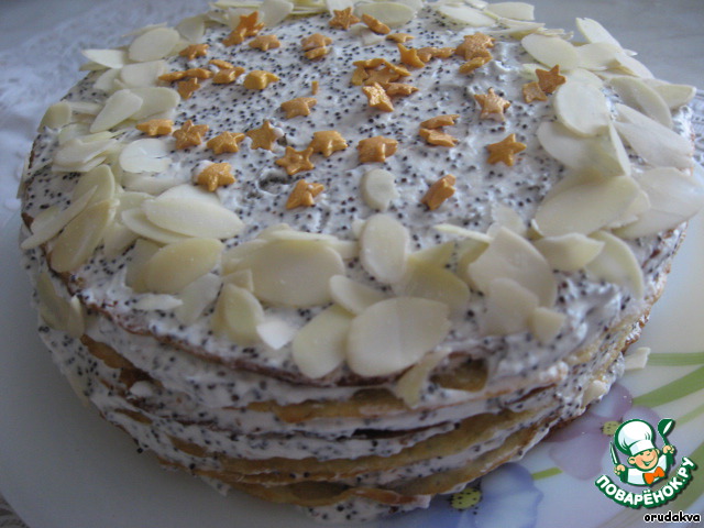 Встречаем Масленицу во всеоружии! Очень вкусный блинчатый торт с прослойкой из творога, мака, сливок и белого шоколада. Рецепт этого блюда был размещeн на сайте в 2008 году пользователем lutsa под названием "Торт "Емеля" и иллюстрирован мной в рамках акции "Раскраски".