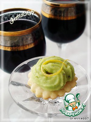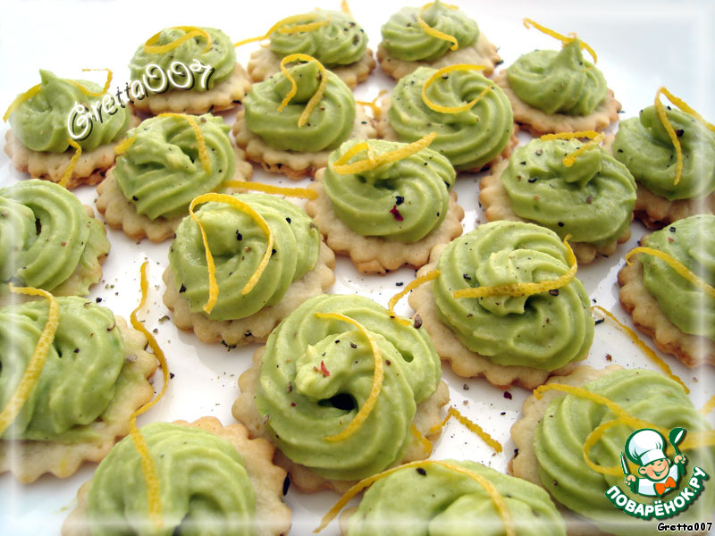 С помощью кондитерского шприца на крекеры отсадим крем из авокадо. Украсим цедрой лимона и свежемолотым перцем.