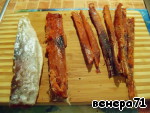 Через три дня с рыбы снять шкурку и разрезать на палочки.