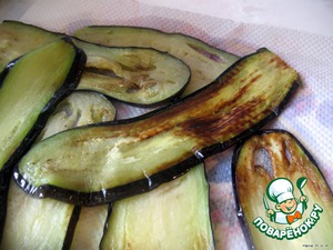Обжарить баклажаны в растительном масле и выложить на бумажную салфетку, чтобы впитался лишний жир.