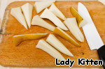 Груши почистить, разрезать на 2 части, удалить сердцевину и каждую половинку разрезать еще на 3 части. В итоге должно получиться 12 кусочков.