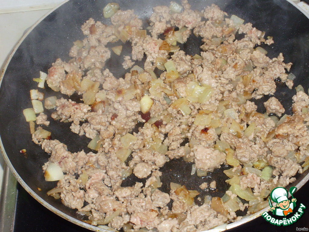 Лук нарезать кубиками и обжарить вместе с фаршем на растительном масле.