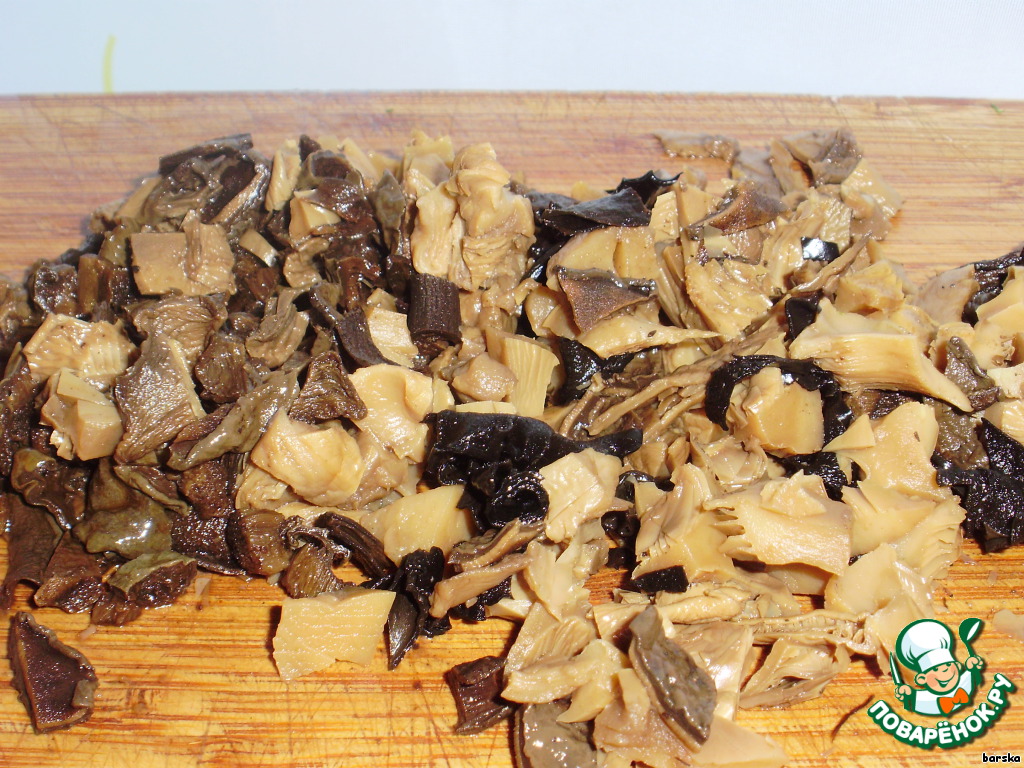 Порезать отваренные грибы. Половину грибов используем в фарш, половину - для соуса.