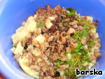 Добавить в картофельное пюре грибы, поджаренный фарш с луком, зелень.