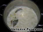 В кастрюльке подогреть молоко с порезанным луком и лавровым листом. Довести до кипения. Выключить огонь и дать остыть в течение 30 минут. Процедить молоко. Лук сохранить.