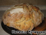 Разогреть духовку до 210 градусов Ц. Перевернуть хлеб прямо из корзины на разогретый (перевернутый) противень (или пекарский камень), присыпанный манкой. Хлеб также сверху слегка посыпать манкой. Сбрызнуть духовку водой из пульверизатора и выпекать хлеб в течение 20 минут. Затем снизить температуру до 190 градусов Ц. и продолжать выпекать еще 30 минут. Хлеб приобретет темно-коричневый цвет. Если постучать по хлебу с нижней стороны, то стук должен быть пустой. Пока хлебушек выпекался, аромат стоял умопомрачительный :)