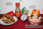 Нам понадобятся: готовые блины, креветки, сыр "Гауда", сыр "Дор-блю", сливки 22%, красный лук, сладкий болгарский перец и острый соус "La Costena Salsa Mexicana".
