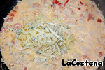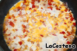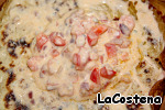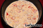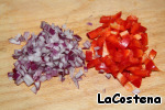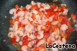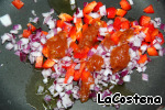 Выкладываем на сковороду лук, перец и заливаем соусом "La Costena".