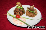 Выкладываем мешочки на тарелку. Кладем немного смеси из овощей и креветок, украшаем и продолжаем отмечать Масленицу!