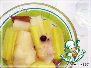 Около 2 см свежего корня имбиря нарезать тонкими пластинками. Залить стаканом воды, добавить уксус, соль, сахар, перец, горчицу, гвоздику и лавровый лист. Не возбраняется положить в маринад и сухой перчик чили.
