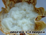 Сделать желе. Желатин залить небольшим количеством воды, дать набухнуть и нагреть до растворения. Сливки (или сметану) смешать с 3 ст.л. сахара, добавить желатин. Как только желе начнет слегка "густеть" - выложить его на 4-ый блин, оставив края.