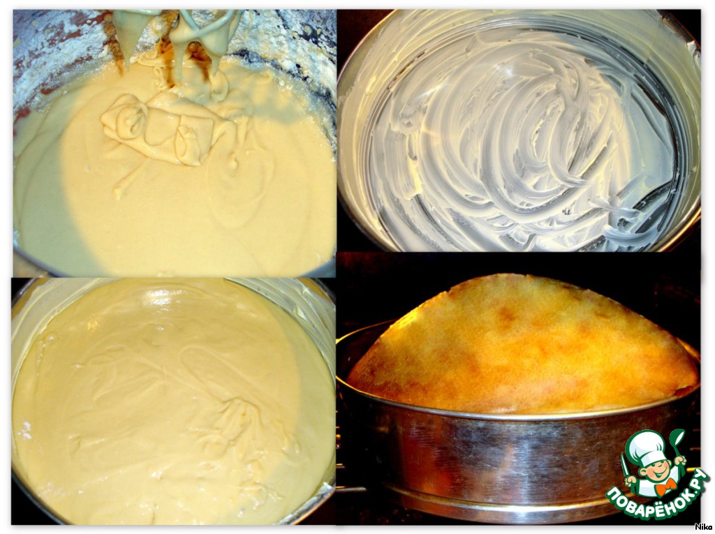Белок отделить от желтка и взбить с сахарной пудрой. Желток тоже взбить и соединить с белком. Сгущенное молоко вылить туда же и всыпать муку. -