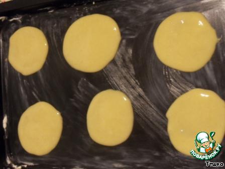 Противень смазать сливочным маслом. 1 ст. л. теста размазать в виде круга.