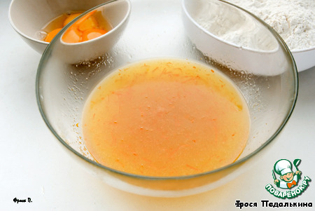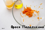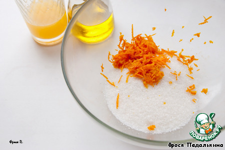 С апельсина снять цедру и выжать сок. Смешать с оливковым маслом и оставшимся сахаром.