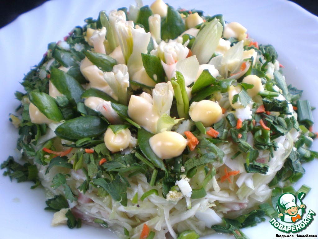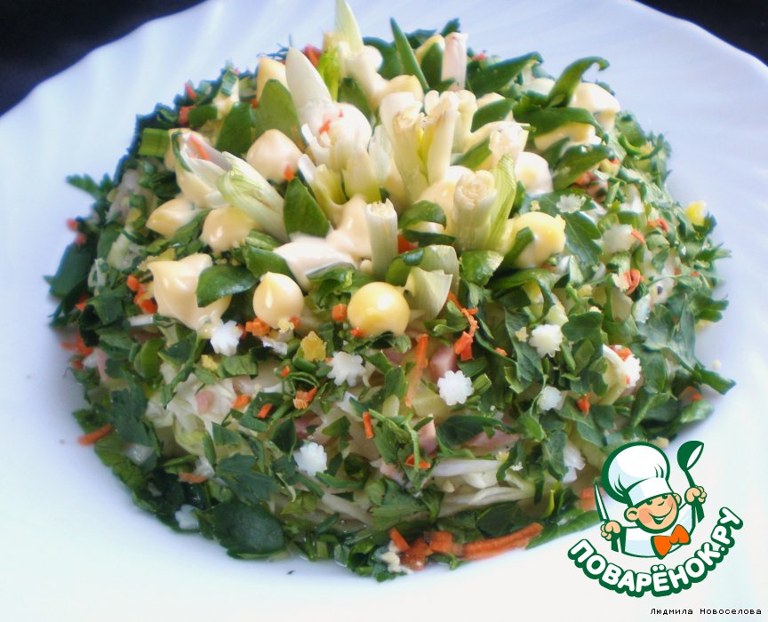 Оформляем. Отрезаем белую часть зеленого лука, слегка надрезаем сверху и вталкиваем в середину салата. Из шкурки огурца вырезаем листочки. Присыпаем мелконарезанной морковкой и нарезанной зеленью. В центр салата выдавливаем немного майонеза.
