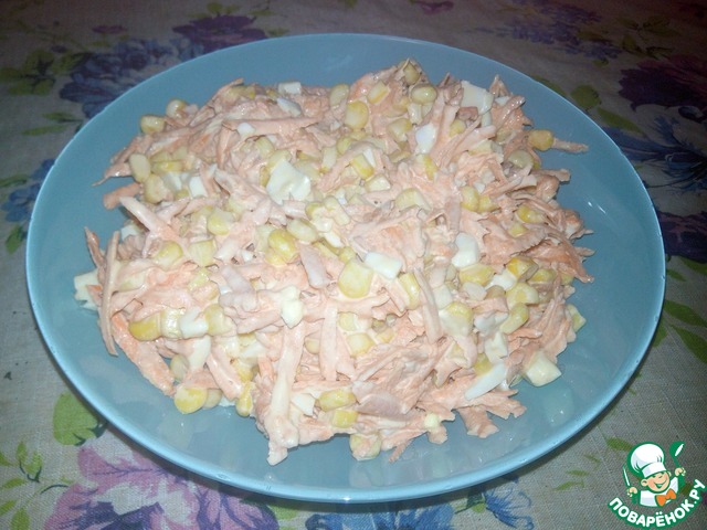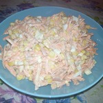Перемешиваем ещё раз и заправляем майонезом. Можно заменить на сметану, но тогда салат посолить.