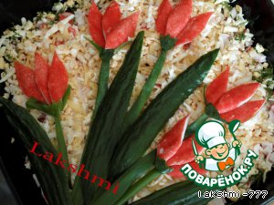 Все слои промазать майонезом и посолить. Украсить по желанию - я срезала с крабовых палочек красную часть и вырезала из неe лепестки для будущих цветов - остальные нарезала в салат. Так же поступила с огурцами - для листьев срезала верхушку огурца.