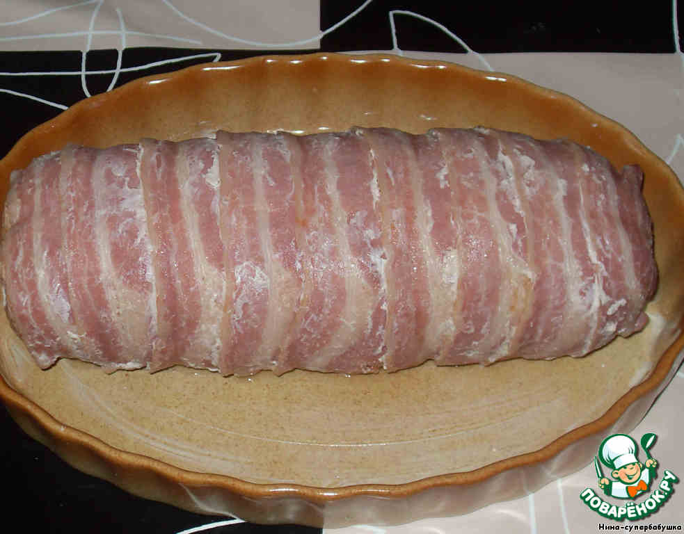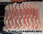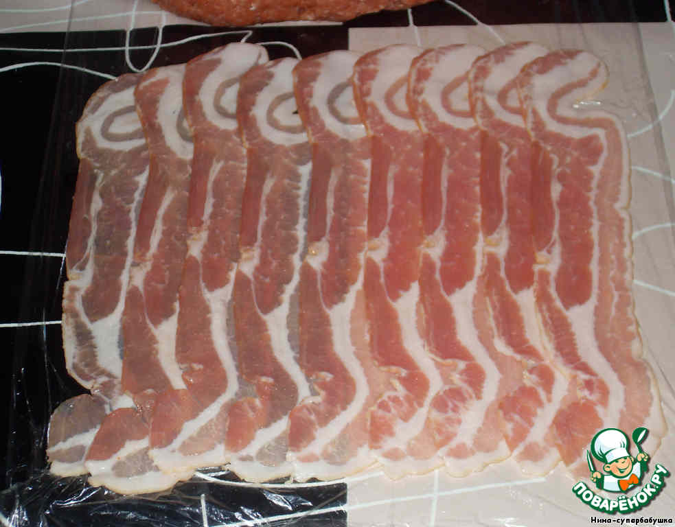 Тонкие ломтики бекона разложить на пленке немного внахлест,