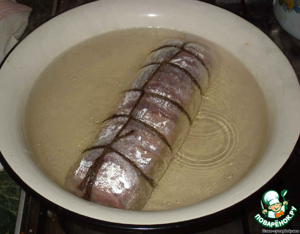 Положить рулет в широкую емкость, залить горячей водой, довести до кипения и варить на среднем огне 30 минут. Вот тут возникли трудности. Ни одна моя кастрюля не подошла, рулет не помещался. Пришлось варить его в самой большой миске.