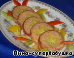Остывший рулет нарезать ломтиками и украсить овощами, слегка прогретыми в масле.