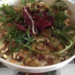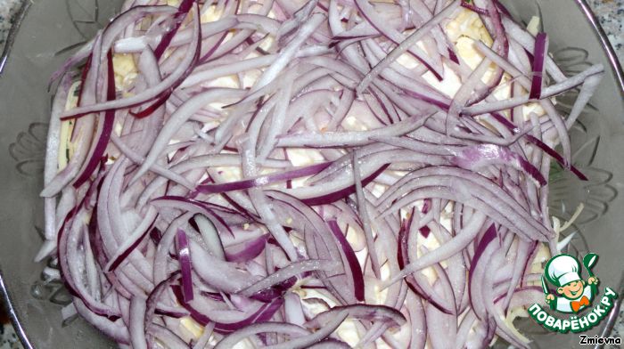 Следующий слой - нарезанное тонкой соломкой яблоко, майонез.